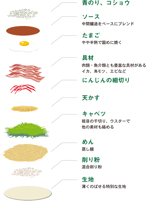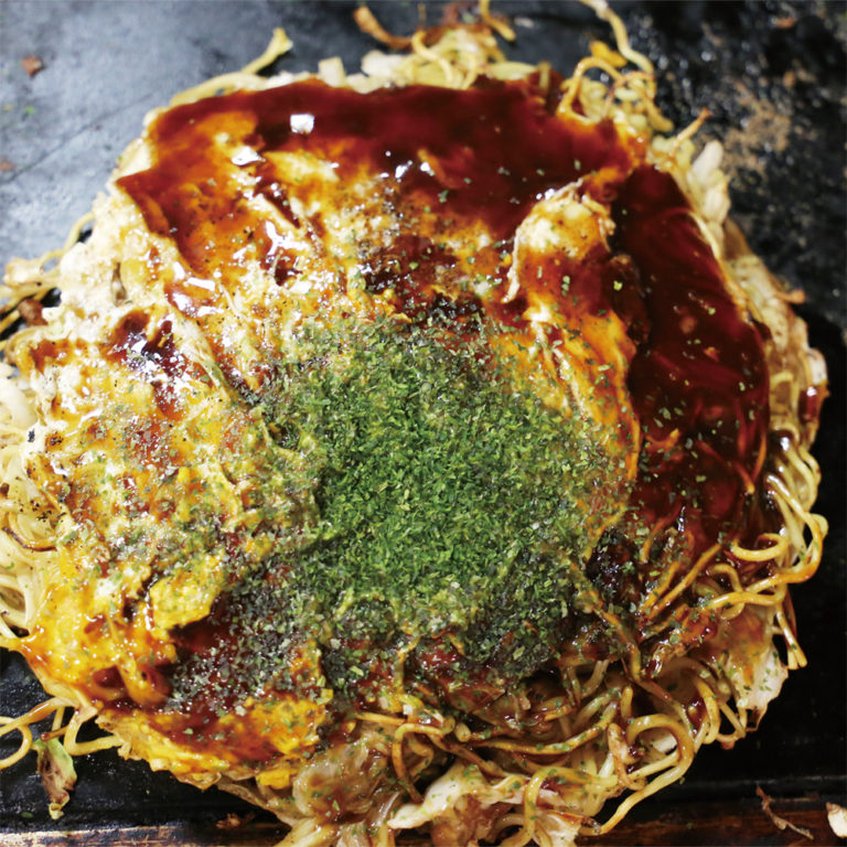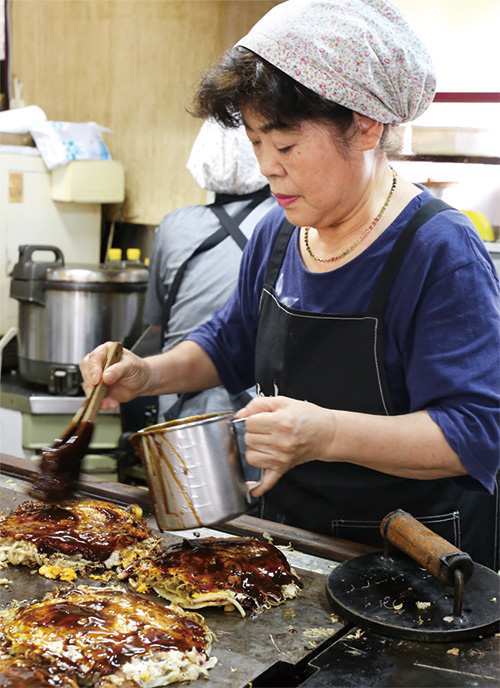 モーニングセット、うどんにオムライス、日替わりランチ等があり、お酒のおつまみもあって喫茶メニューも豊富。しかしやはり目を引くのは店内手前にある大きな鉄板で、配達サービスをしているのでご近所さんから注文で数名の女性陣が何十枚もの具材の違うお好み焼きを次々に焼いて行く。油をあまり使わず、重し鉄板でいい加減に水分を飛ばして、外はカリッと、中はふんわりとしたボリューム満点のお好み焼き。創業30年を超える三原市糸崎町になくてなならない地元愛のお店だが、美味しさのうわさを聞きつけて市外からのお客様も食べにこられるらしい。品数の多さに迷ってしまいそう。