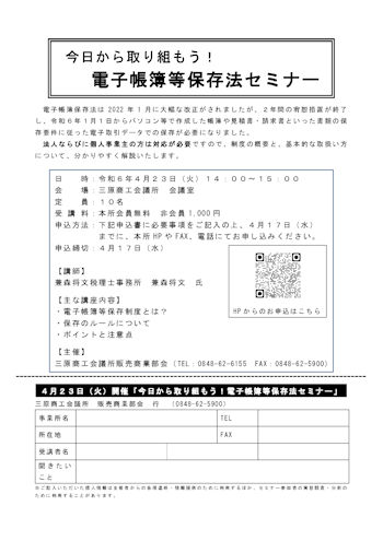 ご記入いただいた情報は、法令に基づく場合などを除き、承諾なしに第三者へ開示・提供することはありません。ただし、三原商工会議所の事業活動、サービス提供とこれに付随する業務を行う目的の範囲内(出席者名簿の作成、説明会案内の送付・講師への名簿提供)で利用させていただきます。