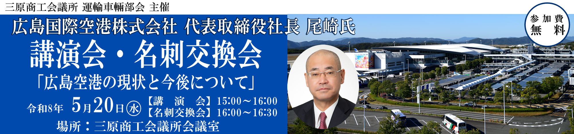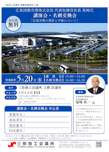 三原商工会議所 運輸車輛部会では、広島国際空港㈱ 代表取締役社長 尾崎氏をお招きし、「広島空港の現状と今後について」と題した講演会、名刺交換会を開催いたします。尾崎社長との名刺交換の場も設けさせていただきますので、是非この機会に多数お申込みください。