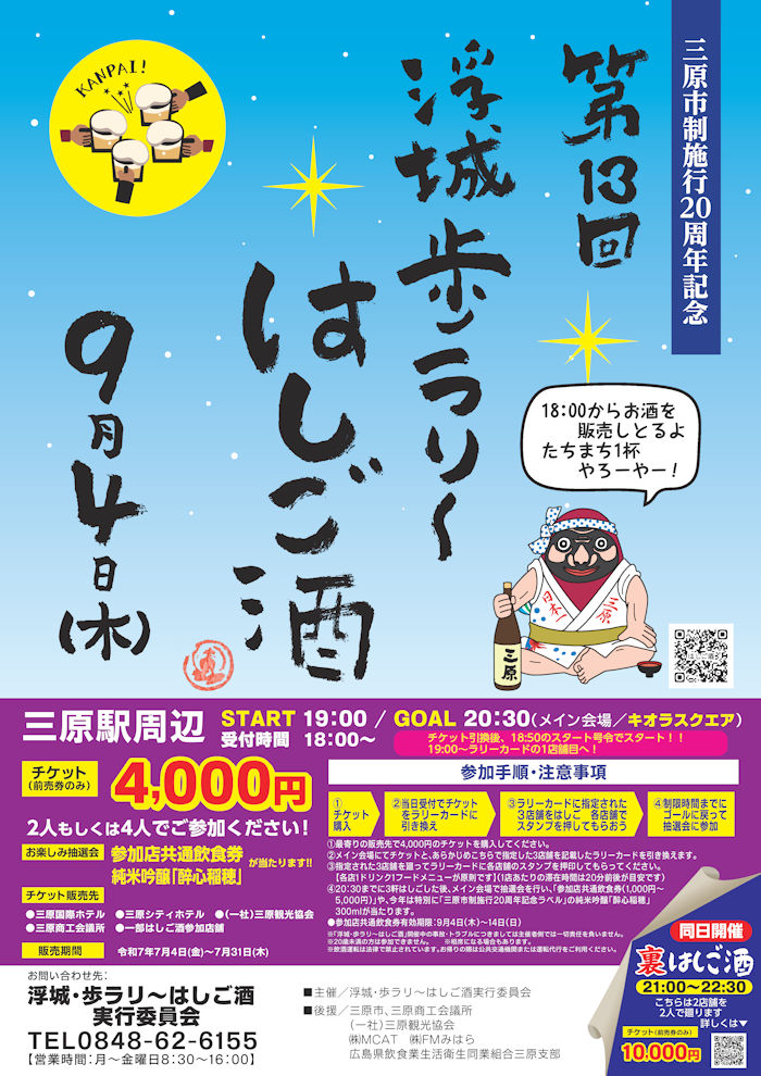 | ●前売券販売 | ・販売予定数:400枚 ・チケット金額:4,000円/枚 ・販売期間:R07.07.04(金)より販売(売切次第終了) ・販売所:三原商工会議所・三原観光協会・三原国際ホテル・三原シティホテル・はしご酒参加店(一部) |