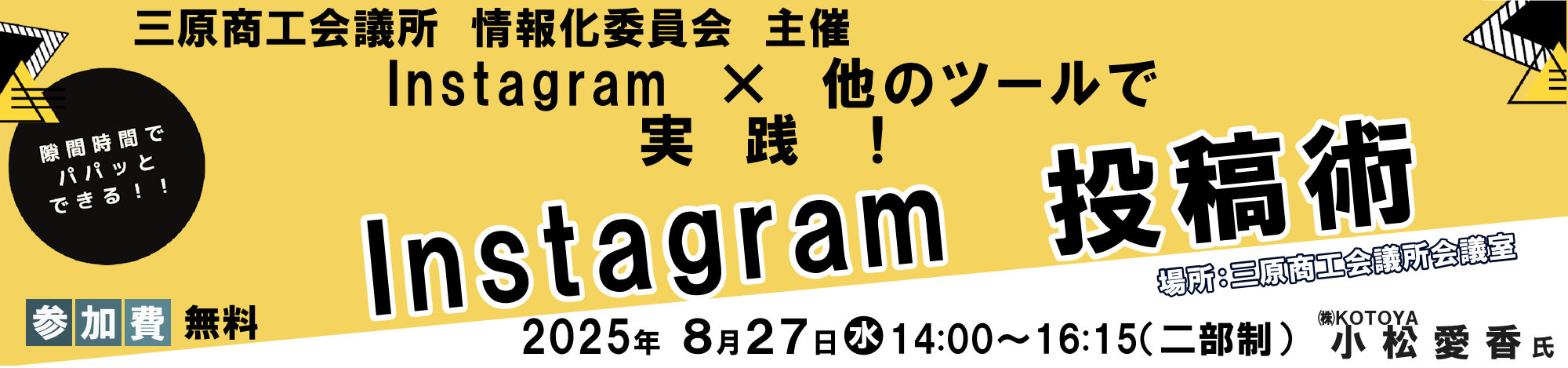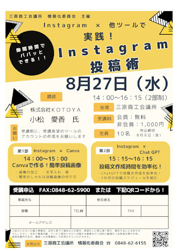今回は、隙間時間でパパっとできる「Instagram投稿術」を 講師に㈱KOTOYA 小松愛香氏を招き開催します。